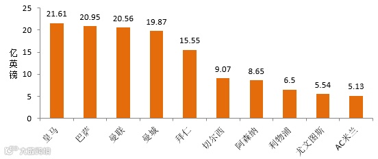 英超各俱乐部的收入在世界足球俱乐部中也位居前列。根据《2015足球俱乐部排行榜》,收入排名前20的俱乐部中,有8家是英超的球队,并且所有英超球队都位列前40名。由于英超球队较强的商业化运作和良好的赛事观赏性,英超球队的转播权收入远超其他几大联赛,转播收入最高的切尔西达1.67亿欧元。