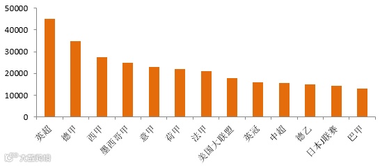 英超联赛是世界上最受欢迎的体育赛事之一,也是商业价值和收入最高的足球联赛。根据PLURI发布的2014足球联赛市场价值排行榜,2013/2014赛季英超联赛的商业价值为36.11亿欧元,比排名第二的西甲高39.25%。从赛事的上座数来看,2013/2014赛季英超场均上座数为36695人,观众总人数位居全球足球联赛第一。