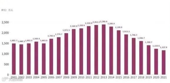 国家统计局《中国统计年鉴2022》显示,2021年我国初婚(即第一次结婚)人数为1157.8万人,比2020年减少70.8万人。这也是多年来初婚人数首次跌破1200万人,创下自1985年以来的新低。