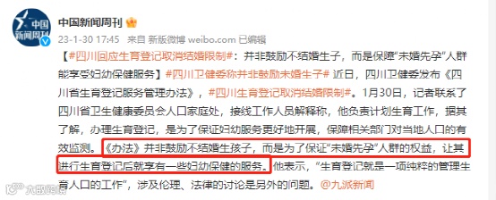 四川省卫健委通过红星新闻回应:“生育登记跟上户口是不一样的。”又通过九派新闻回应:《办法》并非鼓励不结婚生孩子,而是为了保证“未婚先孕”人群的权益。