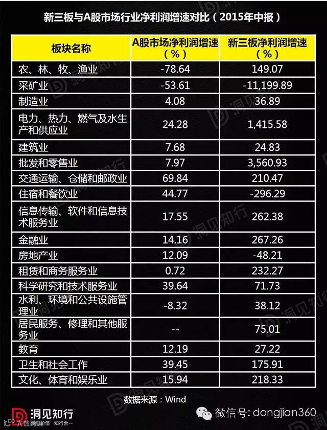利用中报数据比较新三板与A 股市场各行业的净利润增速,可以看到除采矿业、住宿和餐饮业、房地产业表现相对较差外,其他行业新三板的成长性都明显占优。