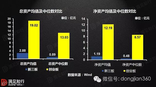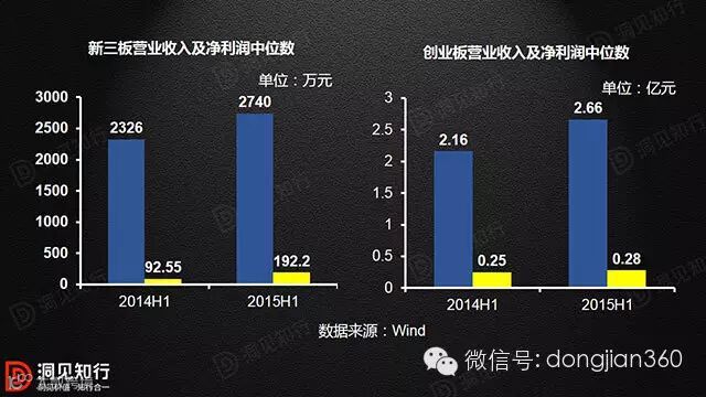 从2015年半年报看,新三板剔除没有任何成交的企业之后,总资产平均值为2.88亿元,总资产中位数为0.89亿元。创业板总资产平均值为19.02亿元,中位数为13.03亿元。净资产方面,新三板净资产均值为1.19亿元,中位数0.48亿元,创业板相应数值分别为12.19亿元和8.57亿元。从营业收入及净利润的角度看,新三板2015年中报显示中位数分别为2740万元以及192.2万元,创业板营业收入及净利润中位数分别为2.66亿元和0.28亿元,新三板是真正面向中小企业的市场。
