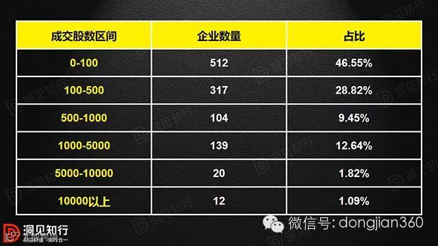 在2014年12月30日至2015年12月30日区间,有成交企业数量仅为1100家。其中512家成交量在100万股一下,成交量100-500万股为317家,500-1000万股104家,1000-5000万股139家,5000-10000万股20家,成交量超过1亿股的仅12家。