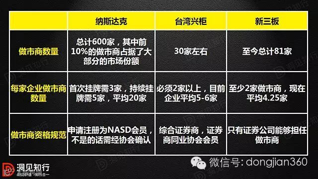 新三板目前有做市商81家,每家做市企业平均做市商数量为4.25家,远低于台湾兴柜每家企业平均的5、6家和纳斯达克的20家。从做市商的资质来说,纳斯达克获取做市商的资质较容易,参与做市的企业并不少;而新三板行政制定券商担任此角色,做市商在目前新三板做市企业快速增加的背景下显得供不应求。