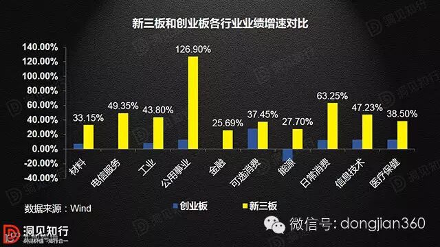 单独与创业板相比,新三板各行业业绩增速全面超越创业板。增速最高的为公用事业126.90%,其次为日常消费63.25%,以及电信服务49.35%。创业板增长最高为可选消费27.86%。