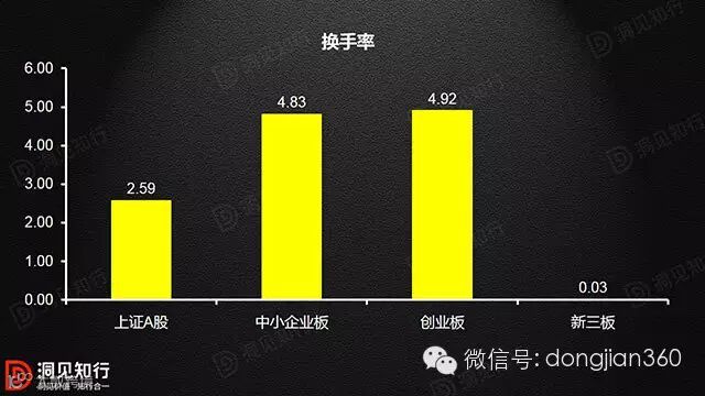 新三板流动性一直是广受资本市场诟病,其稀缺的流动性,使得正常的交易买卖变得并不通畅;交易成本大幅抬升,价格发现存在偏离。比较国内主要交易市场与新三板之间的流动性,以2014年12月30日至2015年12月30日区间统计,创业板整体换手率高达4.92倍、中小板换手率4.83倍紧随其后、上证2.59倍;而新三板整体换手率仅为0.03倍,换手率仅有创业板的0.61%。