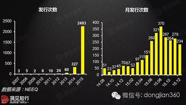 2015年新三板融资功能越来越顺畅,股票发行次数出现爆发性增长。全年股票发行次数逐月攀升,全年共计2493次,总融资额达1216亿元,是2014年股票发行数量的近7倍。比较新三板与A股市场的定增融资状况,可以看到,截止到2015年11月底,新三板定增实施的频率已经大幅超越A股市场,同期募集资金金额已达到A股市场的11.61%。