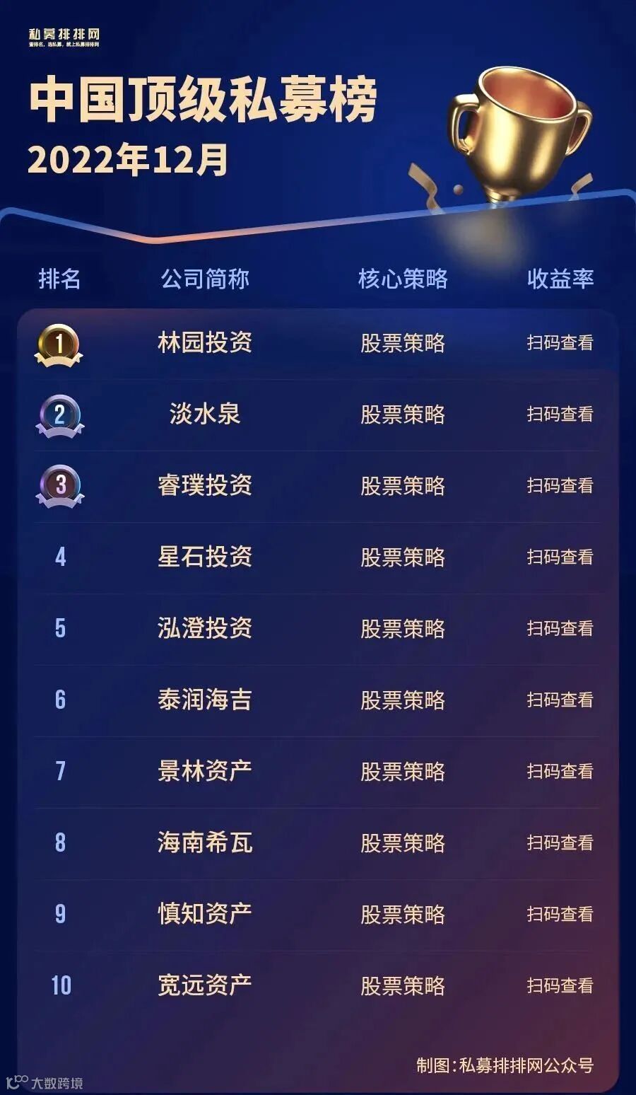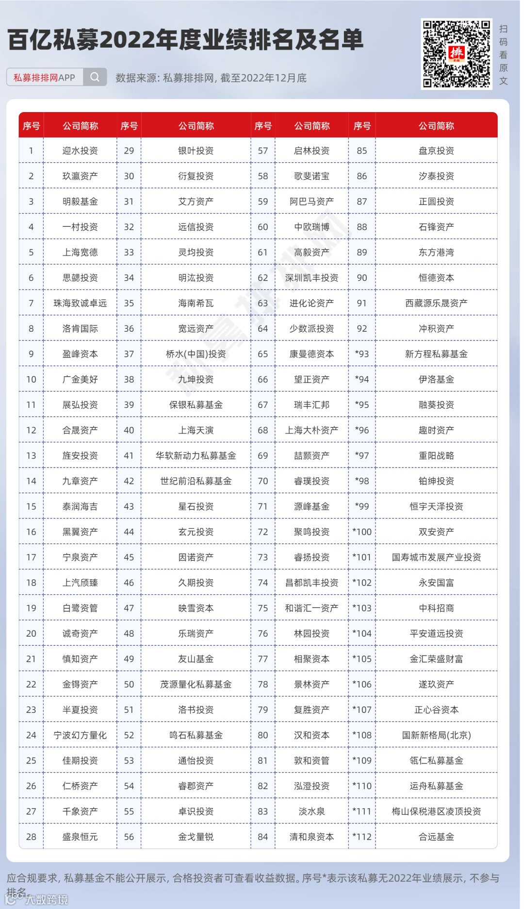 2022年百亿私募前三名分别是迎水投资、玖瀛资产、明毅基金。
