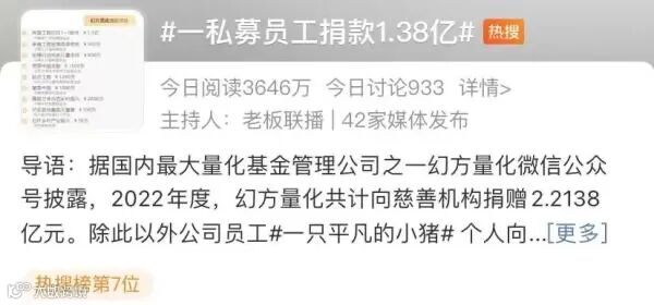 自从上两天幻方量化在官微发文称,2022年,幻方量化共计向慈善机构捐赠2.21亿元。公司员工“一只平凡的小猪”个人捐赠1.38亿元。