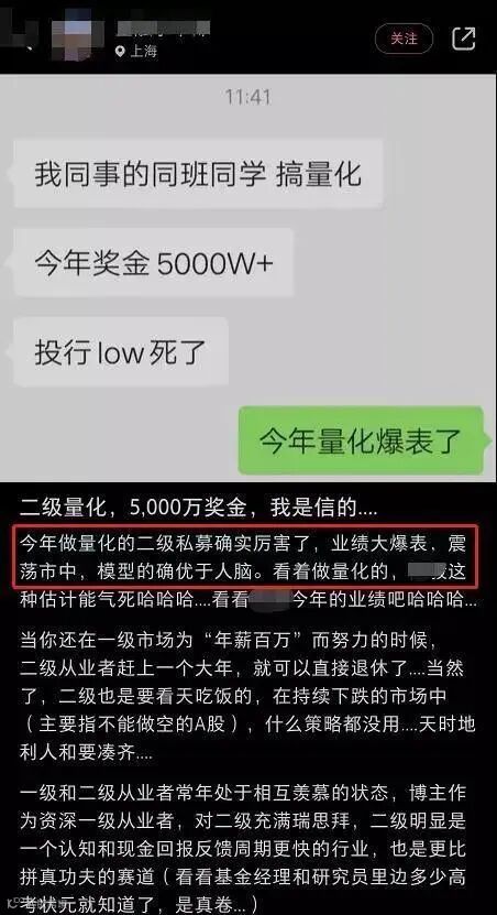 这则消息的发帖博主称:“同事的同班同学做量化,今年奖金超过5000万元。“从某种程度上来说,大家关心的其实不是量化本身,而是量化这个充满“神秘感”的行业究竟有多赚钱以及什么样的人能够从事量化交易行业。