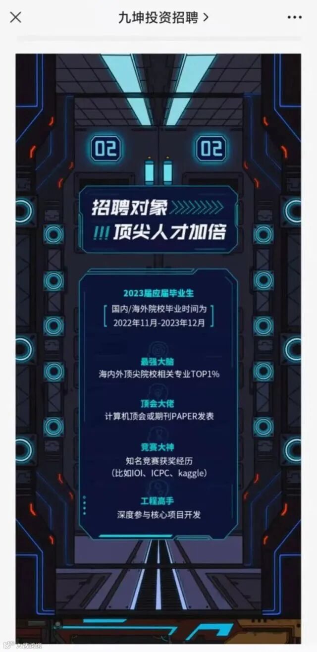 九坤投资的招聘计划也是一样要求严格,除了要求是海内外顶尖院校相关专业TOP 1%之外,还有“竞赛大神”“工程高手”等门槛。