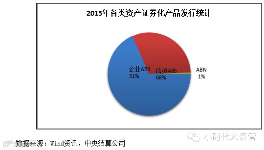 2015年,全国共发行1386只资产证券化产品,总金额5930.39亿元,同比增长79%,市场存量为7178.89亿元,同比增长128%。其中,信贷ABS发行388单,发行额4056.33亿元,同比增长44%,占发行总量的68%;存量为4719.67亿元,同比增加88%,占市场总量的66%。企业资产支持专项计划(以下简称“企业ABS”)发行989单,发行额1802.3亿元,同比增长359%,占比31%;存量2300.32亿元,同比增长394%,占比32%;资产支持票据(以下简称“ABN”)发行9单,发行额35亿元,同比减少61%,占比1%;存量158.9亿元,同比减少5%,占比2%。