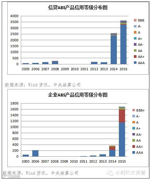 2015年发行的资产证券化产品仍以高信用等级产品为主,在信贷ABS产品中,信用评级为AA及以上的高等级产品发行额为3416.71亿元,占94%;企业ABS产品中高信用等级产品发行额为1645.95亿元,占98%。自2005年首轮试点以来,市场上的产品基本以AAA级和AA+级的高信用等级产品为主,虽然近两年信用层次更加多样,但仍以优良资产为主,尤其是信贷ABS中,有90%的产品评级为AAA级。
