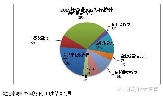 ABS产品中,以融资租赁资产、公共事业收费权以及应收账款为基础资产的产品发行量较大,分别为512.57亿元、414.85亿元和229.96亿元,分别占企业ABS发行总量的29%、23%和13%。除上述大类资产外,信托收益权类产品发行177.45亿元,占10%;小额贷款类产品和不动产投资信托类产品(REITs)分别发行137.8亿元和130.85亿元,均占7%;企业经营性收入类产品发行额77.6亿元,占4%;企业债权类产品发行额42.95亿元,占3%;由保理融资债权、两融债权、股票质押回购债权及公积金贷款组成的其他类产品[ 其中:股票质押回购债券类产品发行33.87亿元,住房公积金类产品发行19亿元,保理融资债权类产品发行13.4亿元,两融债权类产品发行12亿元。]合计发行78.27亿元。