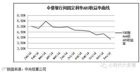2015年,国内经济延续平缓的增长态势,债券市场收益率整体下行,在此背景下,中债ABS收益率曲线呈震荡下行走势,以5年期AAA级固定利率ABS收益率曲线为例,全年收益率下行118个bp。