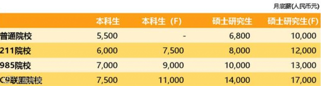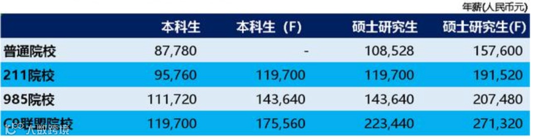 从普通院校本科生8.8万元左右,最后到C9院校的本科生11.97万元,这之间就有三万多元的差距。