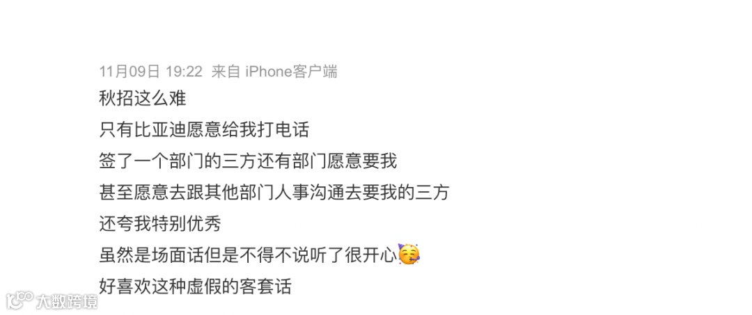我已经听到很多人说校招难,但在知乎里却看到有网友说比亚迪是点击就送,也就是说只要投了简历,就能收到offer。