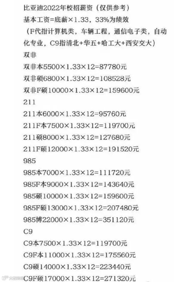 年薪的计算方式=底薪✖1.33✖12,其中0.33为绩效。F是代表计算机、通信电子类、车辆工程、自动化专业。