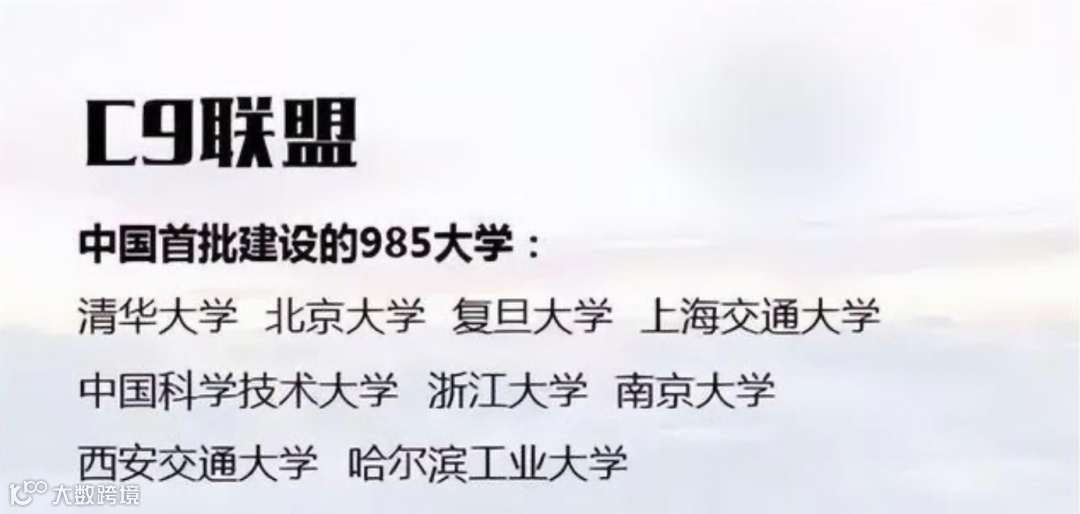 众所周知,我国的c9联盟高校分别是:清华大学,北京大学,复旦大学,上海交通大学,中国科学技术大学,浙江大学,南京大学,西安交通大学,哈尔滨工业大学。