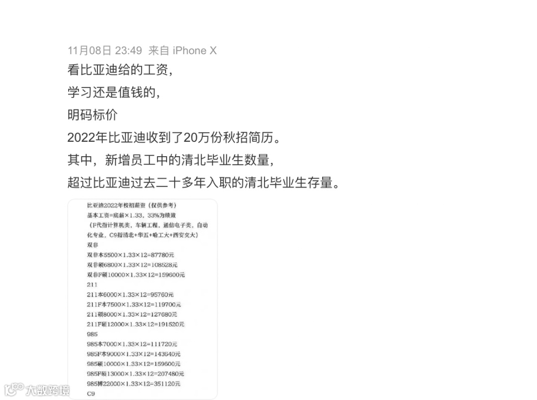 据此,网上还传出了比亚迪招人的薪资待遇标准,被网友成为“学历厂”