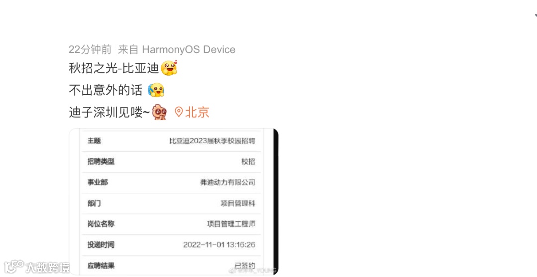 有网友说,比亚迪出offer很快,同时投递的互联网大厂相比较之下,流程多又慢。