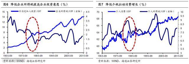 里根学派的核心是减税。以“里根经济学”为例,1981 年里根就任美国总统后,提出“经济复兴计划”,主要措施包括:降低税率,减少政府干预,缩减政府开支,紧缩货币供给。其中,个人所得税边际税率从70%降至28%,提高了可支配收入,增加了劳动供给意愿 ,也推动消费上行;而企业所得税率从46%降至33%,直接提高了企业盈利,也提高了企业投资意愿。里根经济学大获成功,令美国经济迎来“大稳健”时代,也为美国长期经济增长打下了坚实基础。