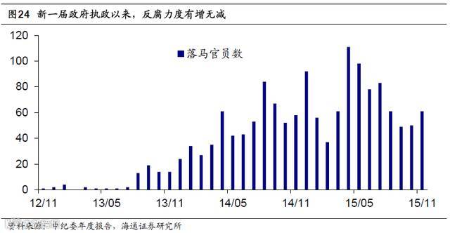 改革行政体制,降低制度成本。政府在“供给侧改革”中同样大有可为,一是降低“制度性交易成本”,保护市场这只“看不见的手”。具体改革力度有强到弱依次是加强反腐、打破垄断、放松管制。中国企业不仅面对来自原材料、税费、财务、人力等领域的显性成本,更面临来自上述领域的隐性成本。以反腐为例,新一届政府执政以来狠抓反腐,落马官员人数有增无减,预计未来也将在这三个领域进一步推进改革。