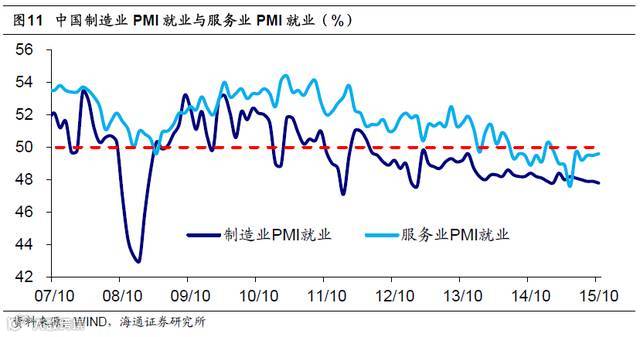 服务业大发展,缓解就业压力。服务业是未来中国经济和社会的双重稳定器,淘汰落后产能意味着制造业部门就业承压,而服务业则可吸纳就业,因而创造条件、促成劳动力的跨部门流动,也将是未来劳动力要素改革的重要方向。根据统计局数据测算,第三产业每增长1 个百分点能创造约100 万个就业岗位,比工业多50 万左右。而考察企业就业状况,07 年以来,服务业PMI 就业在绝大多数时期高于制造业PMI 就业指标,这意味着服务业就业状况好于制造业,将成为未来主要的就业容纳器。