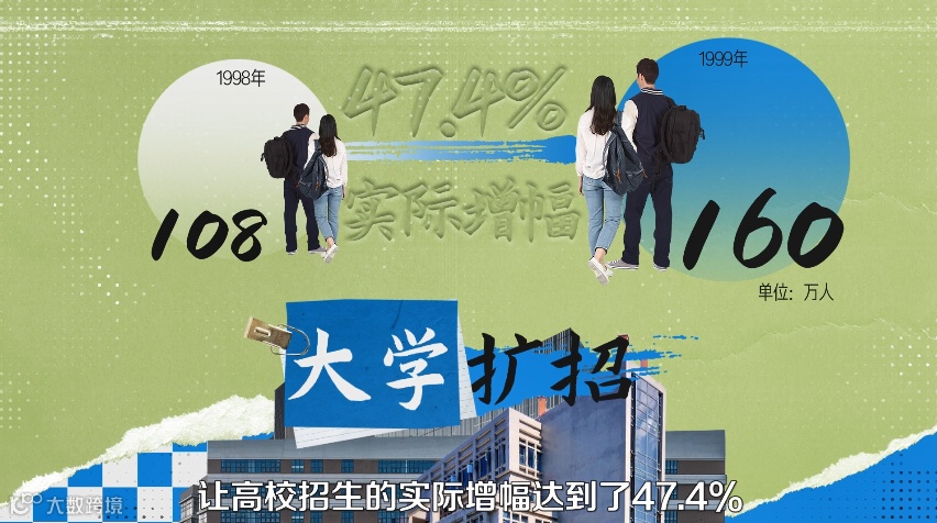 扩招政策出炉后,让高校招生的实际增幅达到了47.4%,比上年多招了52万人。要知道高考恢复以来,这个增幅每年只能维持在8.5%左右。
