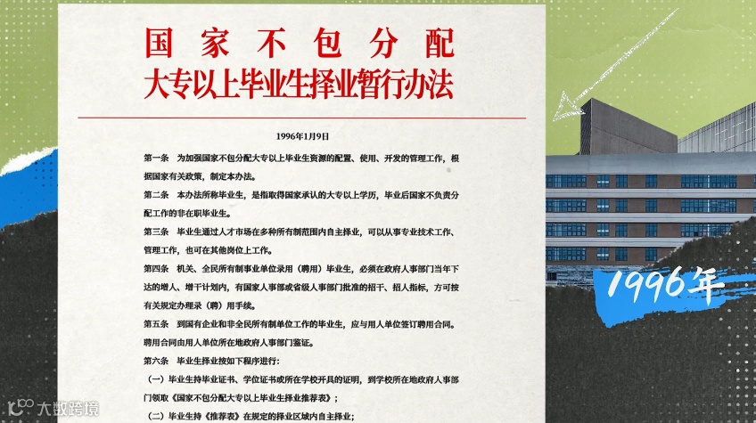 一是1996年,原人事部印发了这份文件《国家不包分配大专以上毕业生择业暂行办法》,大学生包分配制度正式宣布退出历史舞台。