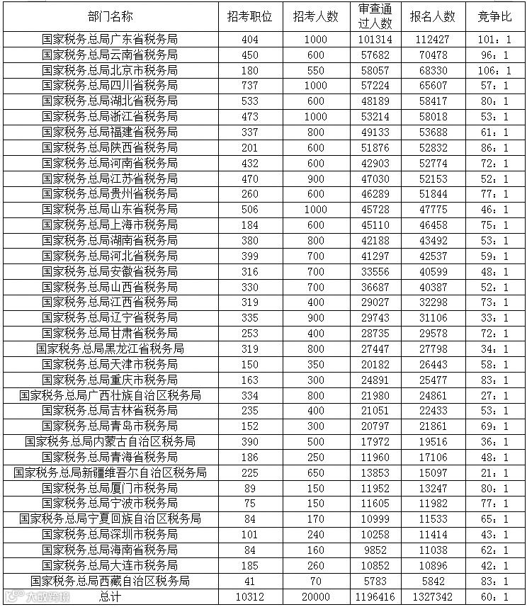 广东省税务局为本次报名的“明星”部门,为税务系统仅有的一个报名人数与过审人数都过10万的部门,有112427人报名,101314人过审,平均竞争比为101:1。