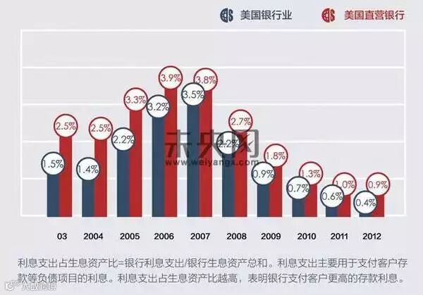 在2003年-2012年间直销银行的数据与银行业数据趋势相同,但一直稳定高于银行业平均水平。说明直销银行十年间一直提供了比银行业平均水平更高的存款利率,以吸引更多的储蓄用户,例如,RBC Bank与CIT Bank分别提供3%与0.9%的在线储蓄账户收益率,远高于银行业平均值0.11%。