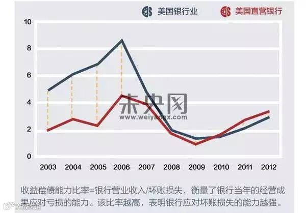 (2)金融危机期间,直销银行的人均利润低于整个银行业。金融危机之前,直销银行的人均利润从2003年的18.97万美元增长至2006年的33.22万美元。金融危机期间,在2007-2009年,新兴的直销银行和整体银行业金融危机期间盈利额大幅下滑,但直销银行受到的冲击明显大于整体银行业。