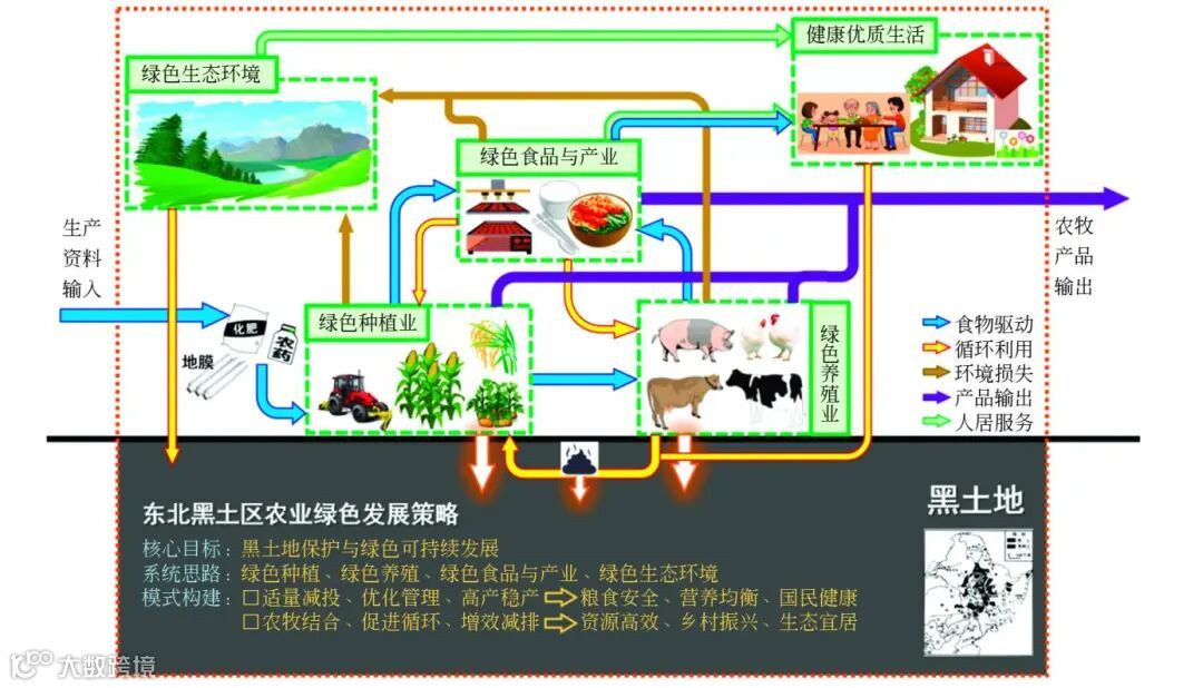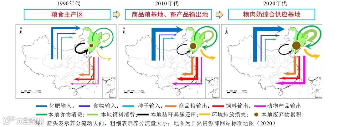 东北黑土区是国家重要的商品粮基地和畜牧产区,对保障国家粮食安全发挥了重要作用。东三省粮食外调量常年占全国60%以上,每年生猪年调出量至少600万头,猪肉和禽蛋“南销”比例接近50%,乳品和牛肉超过60%。随着东三省农牧产品不断输出,区域农牧业生产规模、集约化程度在大幅增加,并形成以“高产品输出—高资源输入”为特征的高度集约化农牧生产格局。