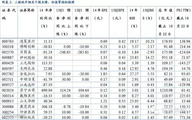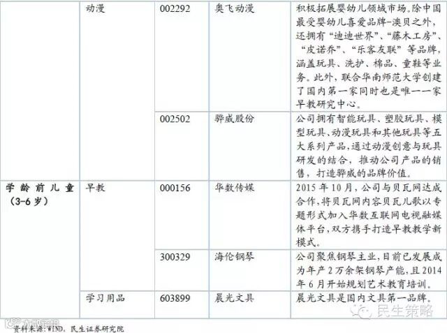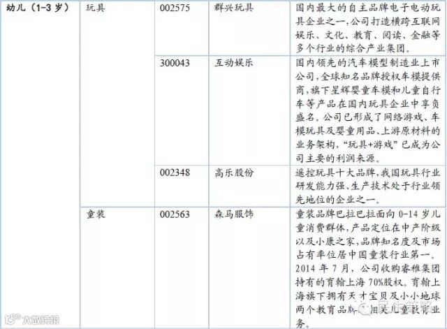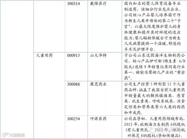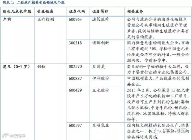 重点把握孕妇产前、新生儿婴幼儿时期受益于需求增长的相关行业。二胎全面放开有望带来新生儿的大幅增长,新生儿在出生、成长中涉及的行业将迎来需求的提振,提升相关公司业绩。依照新生儿的生长过程,我们将投资主线分为四条:产前(怀孕期)、婴儿(0-1岁)、幼儿(1-3岁)及学龄前儿童(3-6岁)。由于从婴儿长大到儿童的时间距离目前较远,投资的重点可放在产前、婴儿、幼儿时期。具体投资标的如下: