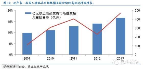 幼儿:重点关注童装、玩具、动漫。在幼儿时期,由于年龄的增长,对服装、娱乐的需求将增加,娱乐的方式具体有玩具、动漫等。近年来,儿童玩具市场成交额稳定增长,2013年市场成交额达到415.27亿元,年增长率18.75%,相较2010年增长50.57%,未来随着儿童数量的增加,玩具市场的交易额有望持续保持较高速地增长。随着年轻父母对儿童衣着的重视度提高,未来随着年轻父母的增加,儿童服装的需求有望进一步提高,国家统计局发布的《2012-2015年童装产业报告》显示,童装产业产值年增长率可达25%-30%,远高于成人服装业。因此,幼儿时期,重点关注儿童服装、玩具生产商、动漫传媒提供商。