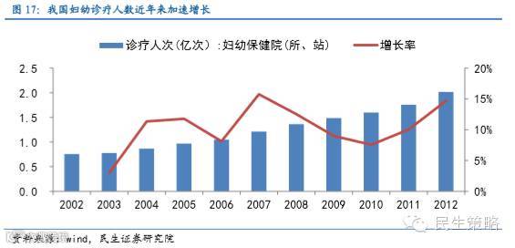 产前:重点关注孕妇检测、辅助生殖服务、孕妇用药。在生产前,为保证顺利生产,孕妇及胎儿检测、孕妇身体的健康将成为家庭关注的重点。2010年以来,我国妇幼保健所诊疗人次加速上涨,增速由7.6%增长至14.7%,在新增人口明显明显增长的背景下,诊疗人次的增加,显示出家庭对孕妇、婴儿健康关注度的提高。同时由于社会压力大、晚育比例升高,不育不孕的夫妇数量在增加,为帮助妇女怀孕,辅助生殖需求量在增加。因此,在产前,重点关注提供孕妇检测、辅助生殖服务的医疗机构以及生产孕妇用药的企业。