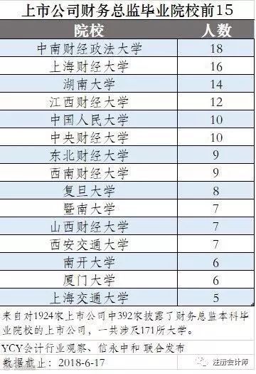 前段时间,有平台对来自对1924家(约占全部的6成)上市公司的统计,其中392家披露了财务总监本科毕业院校,一共涉及171所大学。另,北工商、对外经济贸易大、福州大学、广东财大、哈工大、合工大、吉林财大、南京财大、川大、天商、武大、浙江财大、浙大、郑州航空工业管理学院、中山大学各有4人。