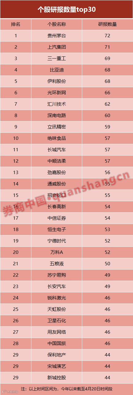 贵州茅台相关研报高居榜首,共有72篇研报;上汽集团紧随其后,有71篇研报。