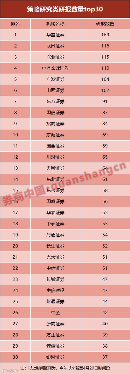策略研究来看,60余家券商发布了2789篇相关研报,华鑫证券、联讯证券、兴业证券、申万宏源证券、广发证券、山西证券的策略研究类报告均超100篇。