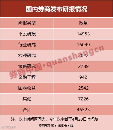 据朝阳永续提供的数据,从1月初至4月20日,共有83家国内证券公司发布了46523篇研究报告。其中个股研报14953篇,覆盖1637家A股上市公司;行业研究报告16049篇,策略研究报告2789篇,固定收益报告2542篇,宏观研究报告2022篇,金融工程研报942篇。