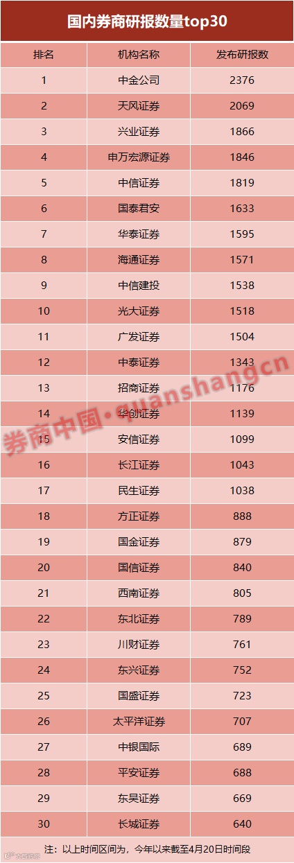 按WIND数据统计,2018年中信证券共对外发布研报达6824份,其次为天风证券、申万宏源年产研报分别是6038、5926份。按券商中国记者最新统计,截至4月20日,2019年以来,中金公司发布的研报数量最多,为2376篇;天风证券紧随其后,研报数量为2069篇,第三名是兴业证券,为1866篇。简单估算,有望超过去年前三水平。