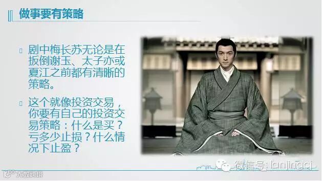 剧中梅长苏每一个举动都有清晰的策略,这个和交易一样,要对涨了有应对策略、对跌了也要有应对了策略。