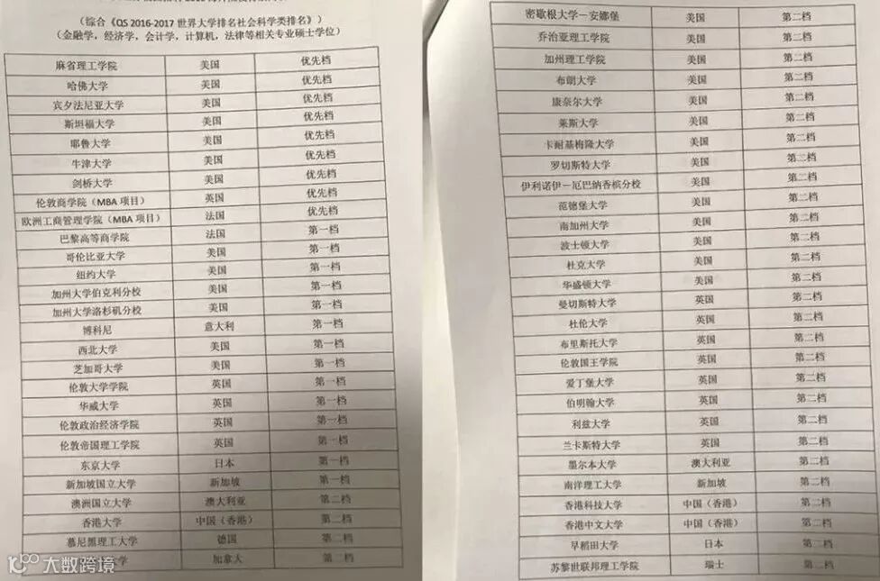 网上流传的中金海外院校名单中,美国14所,英国9所,欧洲大陆5所,香港3所,澳洲3所,新加坡2所,日本1所,共分为三档。