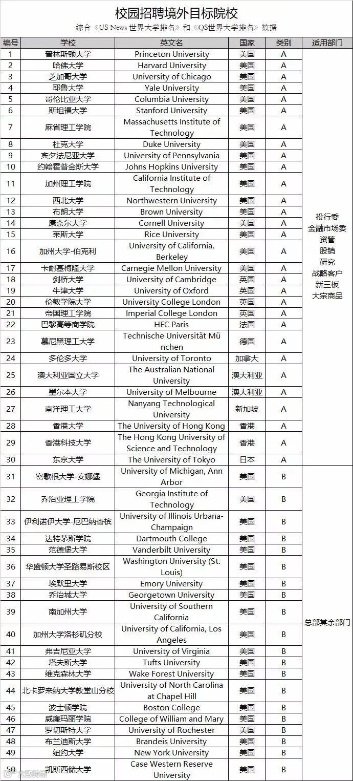 而中小券商一般没有专门的target school,但自己也会参考一些比较有名的高校排行榜,包括US News & World Report,QS,Times以及上海交大ARWU,侧重点各不同。