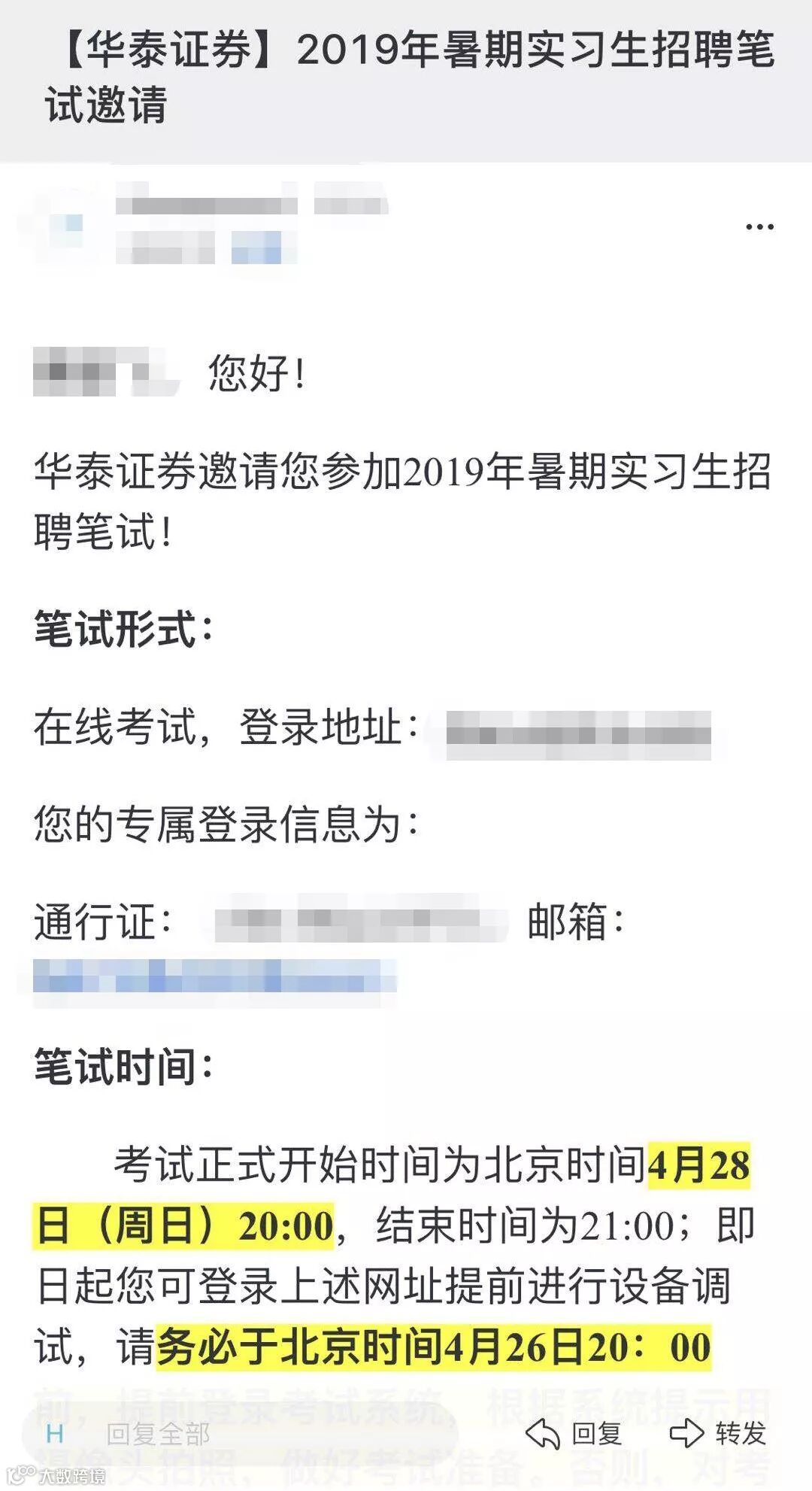 昨天,“华泰证券招聘”公众号发布了最新的《2019年暑期实习生校园招聘笔试通知》,考试时间为4月28日20:00-21:00,考试方式为线上监控考试。
