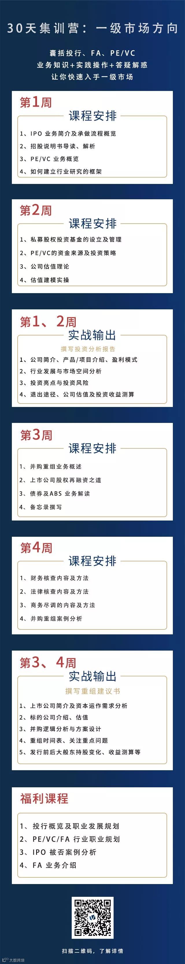 当然,很多同学是没能从大一就严格规划好自己的大学的。对于那些缺乏实习经历又来不及弥补的同学,大家尽量在一些性价比高的地方进行提升,比如笔面试能力,或用一个月集中提升投行/行研实务能力(金融小伙伴一级集训营和二级集训营已举办十几期,累积帮助数百名同学拿下投行/行研/PE/VC等机构Offer,可以扫码咨询)。