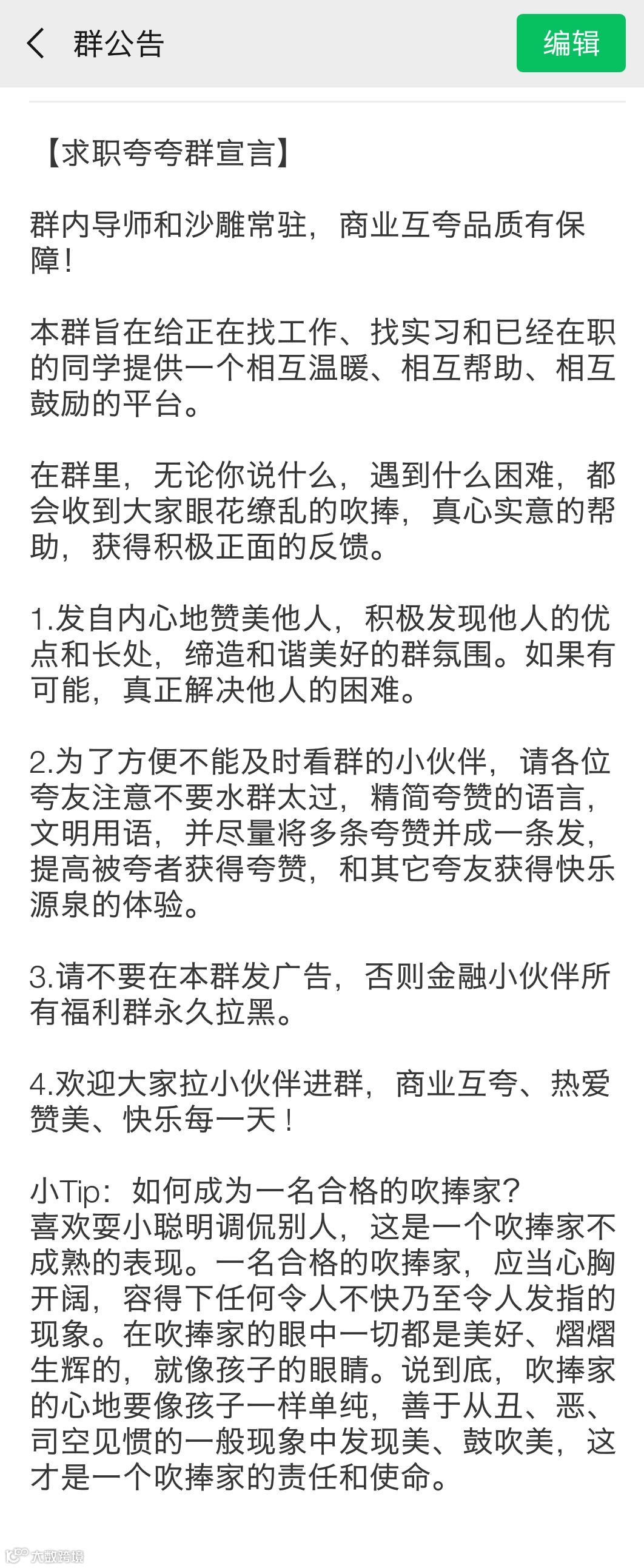 而处于找工作、找实习和工作不久阶段的小伙伴,或多或少会有焦虑、困惑、茫然的情绪。因此,你可以加入这个传播阳光快乐的【求职夸夸群】,互相赞美,加油鼓劲!