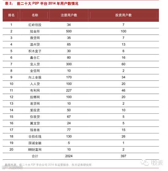 银行将成为P2P平台资金托管机构,P2P平台有望与银行在用户共享方面达成合作。一直以来银行缺乏用户思维,仅仅拥有渠道价值,P2P平台对屌丝用户的维护和运营能够很好地补充银行在这方面的弱势。目前看,P2P平台已经拥有了海量用户,其中前20大平台在2014年底的注册用户数已经达到2024万人,投资用户数达到397万人。我们判断,到2015年年底,投资用户数将增长至2500万人。此前投哪网曾尝试与招商银行发布联名信用卡,也说明了P2P平台变现用户的一种努力方向。
