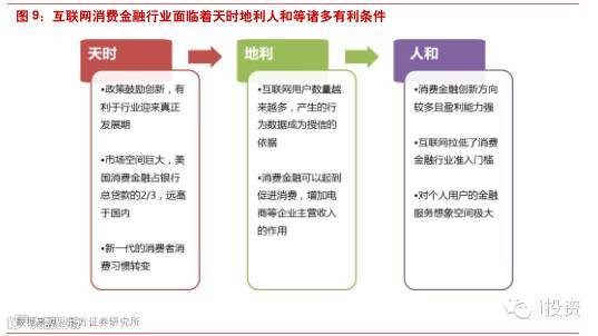 在互金指导意见中,消费金融也是政策明确支持的方向,意见提出将鼓励消费金融机构依托互联网技术,实现传统金融业务与服务转型升级,积极开发基于互联网技术的新产品和新服务,同时也支持相关机构与互联网企业开展合作,拓宽金融产品销售渠道与产品形式。我们认为,国内互联网消费金融行业的发展正面临着天时地利人和等诸多有利因素,我们看好相关领域的爆发式增长机会。